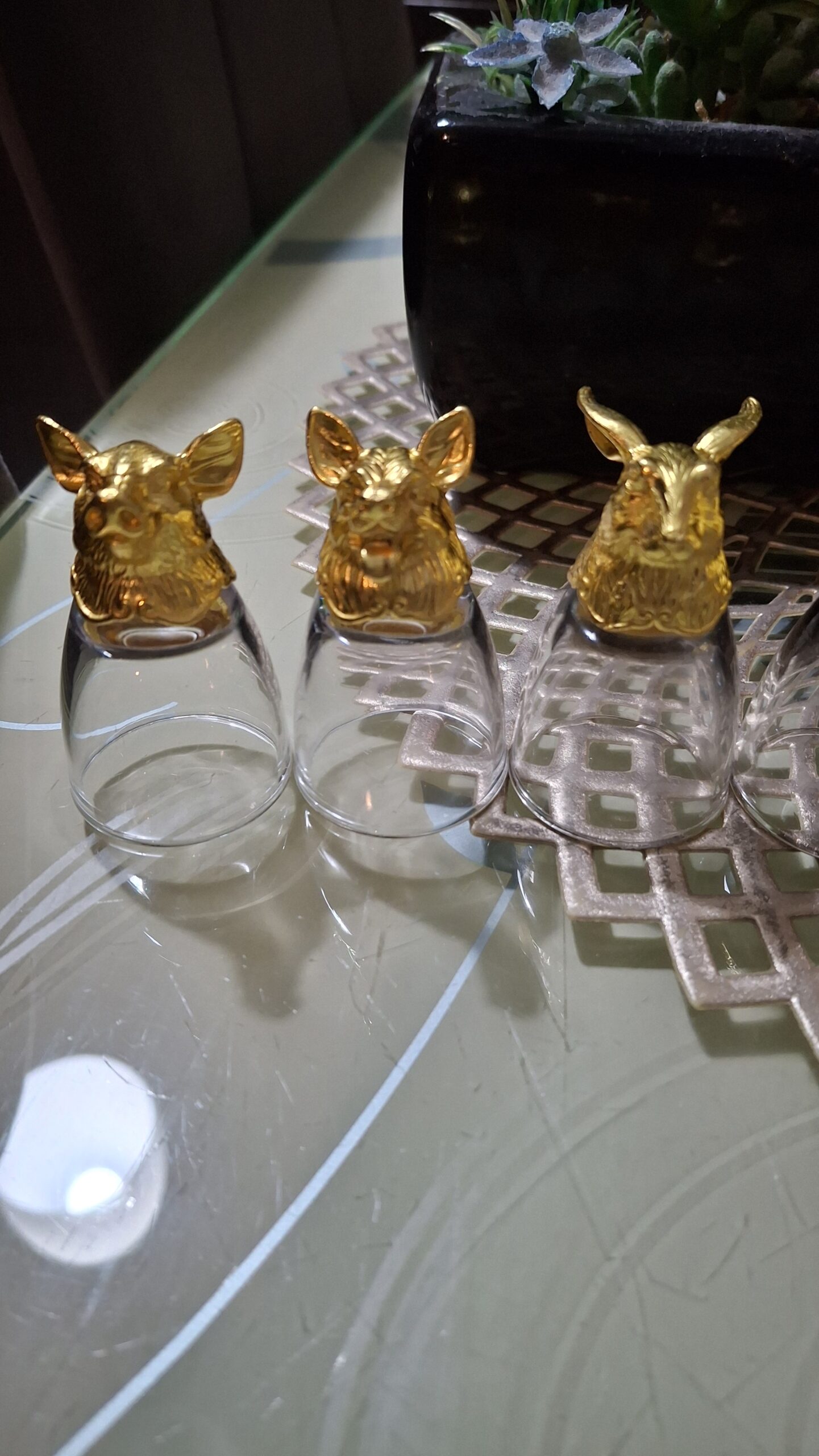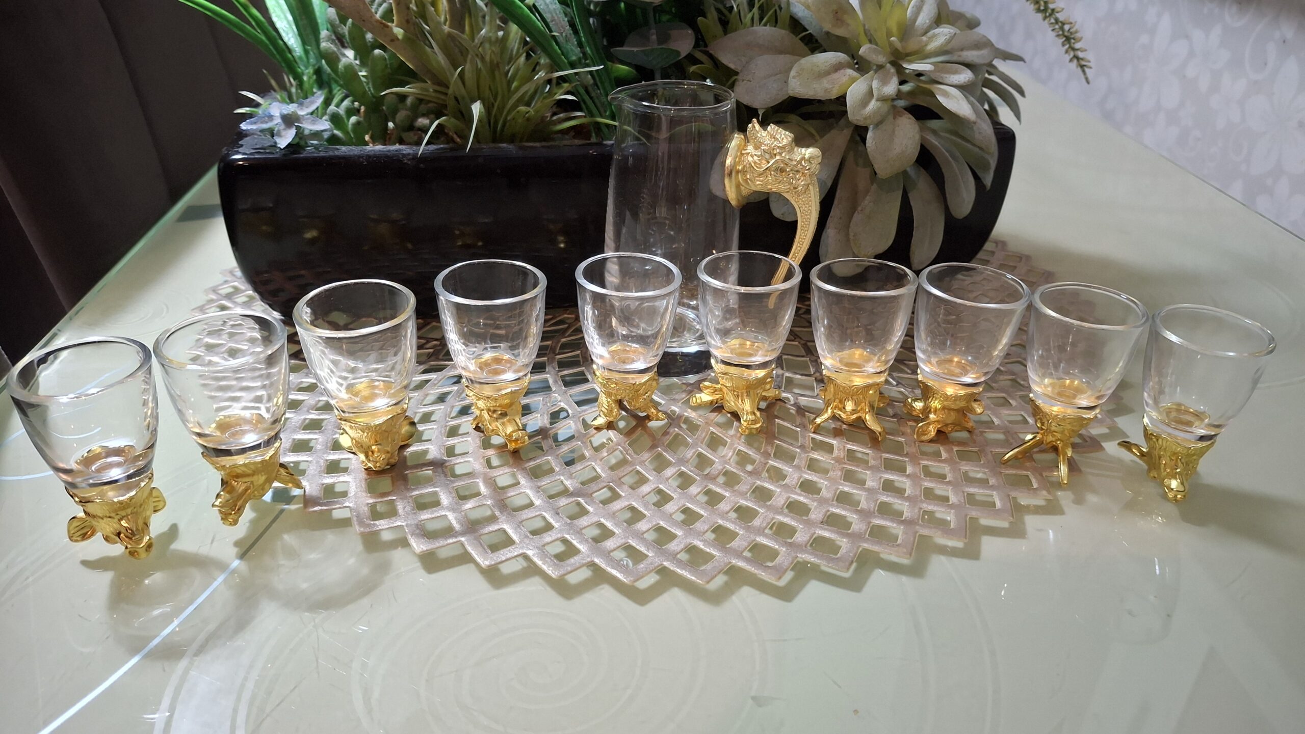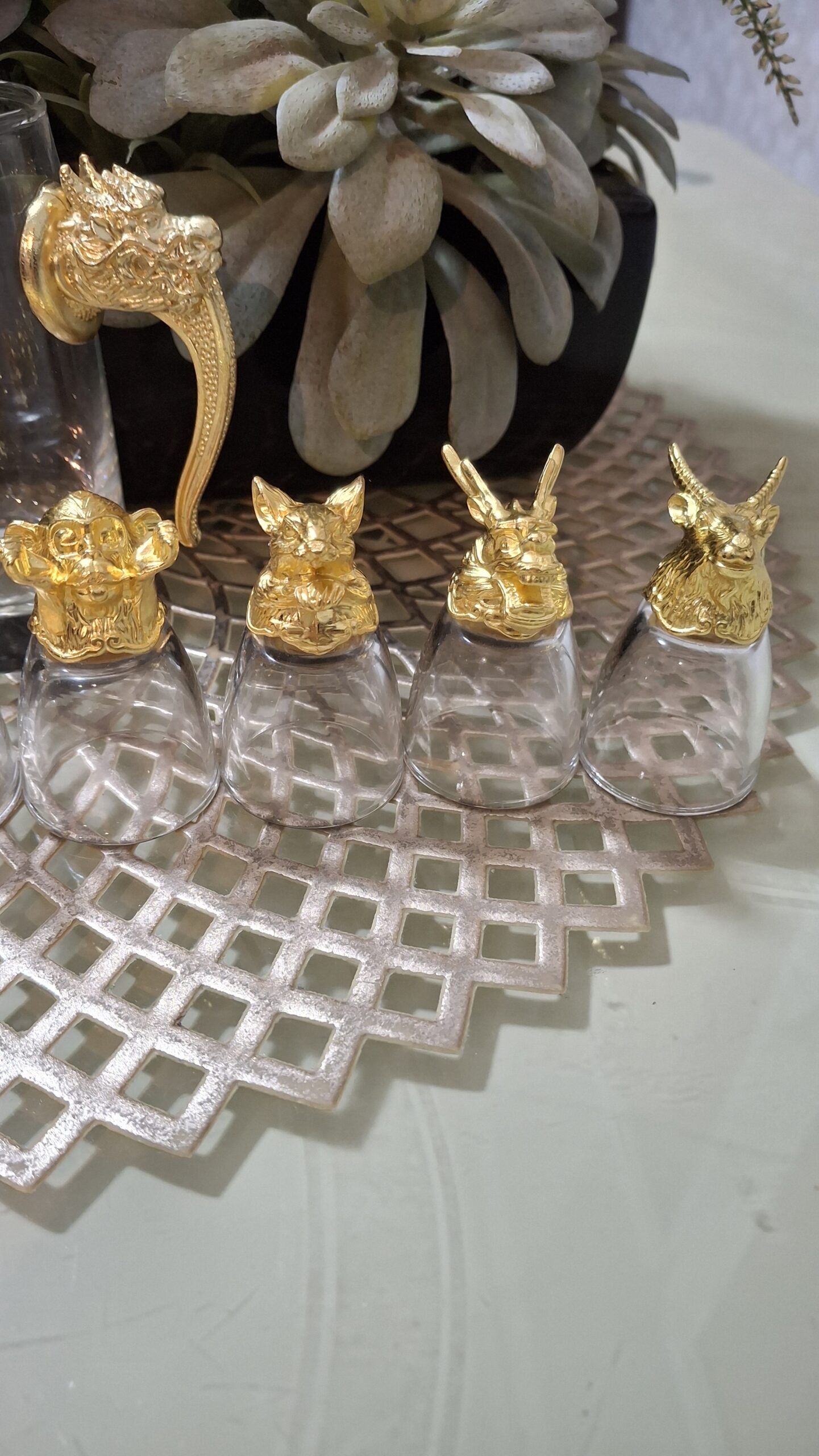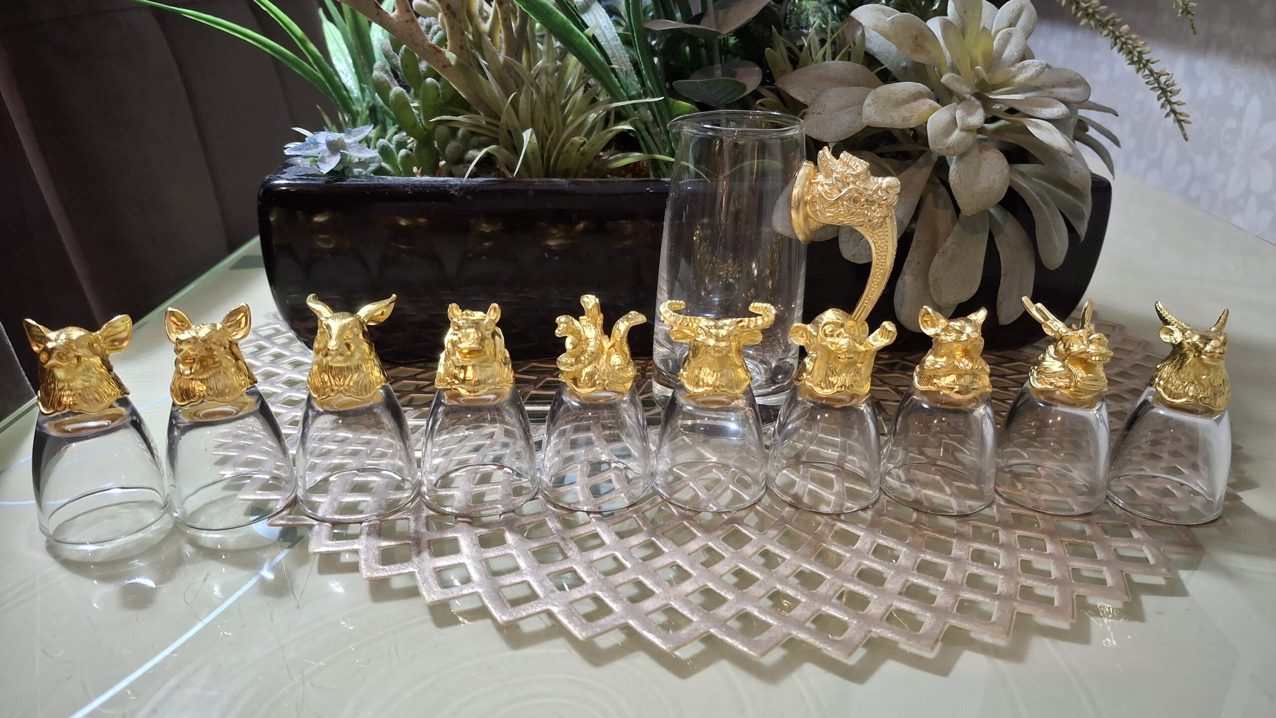 Parduodamas taurelių rinkinys – 10 taurelių su dekoratyvinėmis gyvūnų galvų figūromis ir derančiu ąsočiu. Tai ne tik praktiškas, bet ir labai dekoratyvus rinkinys, puikiai tinkantis šventėms, kolekcijai ar dovanai.
